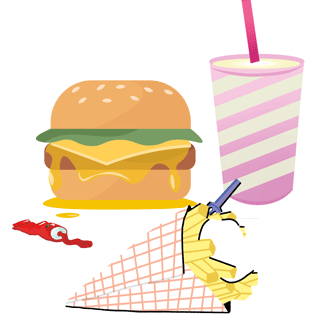 Pommes frites, Hamburger, Milchshake, Ketchup, Mayonnaise…